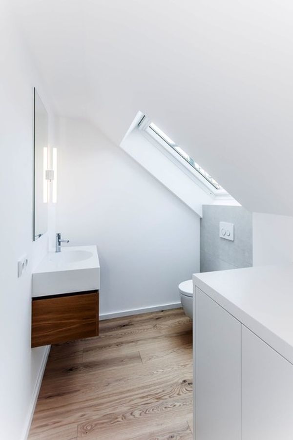 Allerdings wuerde ich diese auch horizontal waagerecht verlegen. Clever eingesetzt bieten sie aber auch enorme moeglichkeiten fuer schoene helle und kompakte baeder. Malen sie die schraegen waende des badezimmers die gleiche farbe wie die decke.