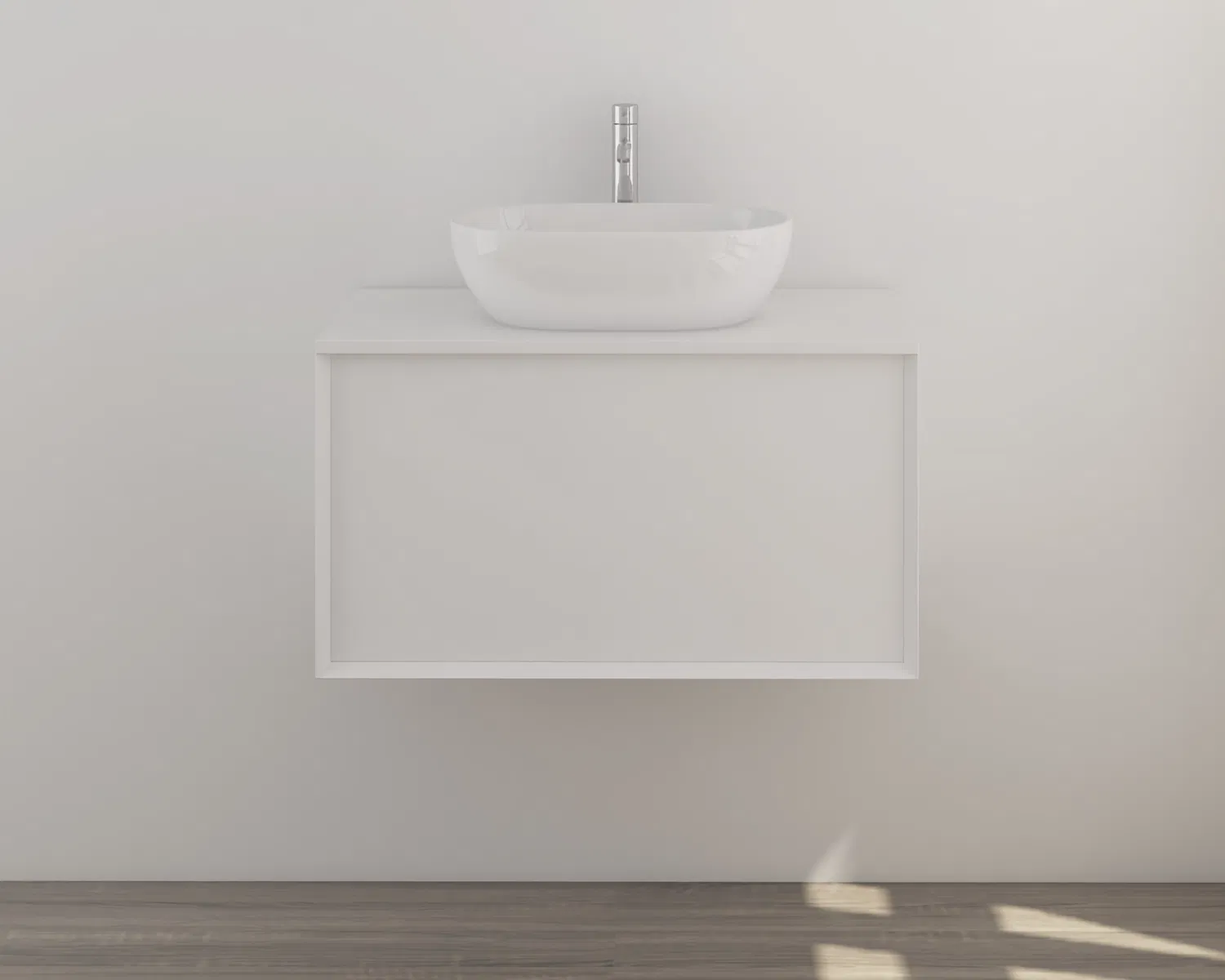 Zu dem set gehoeren ein weisser mineralgusswaschtisch und ein waschtischunterschrank mit zwei tueren zum verstauen von handtuechern und weiteren badtextilien.