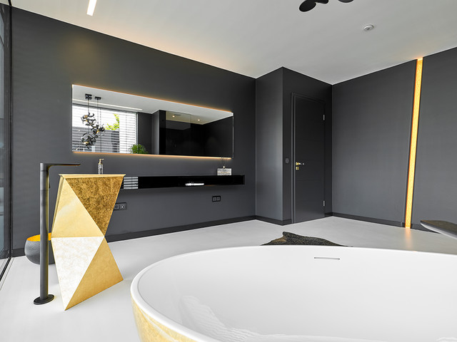 Luxhauskundenhaus01 scandinavian bathroom nuremberg photo of a mid sized scandinavian 34 bathroom in nuremberg with flat panel cabinets white cabinets a freestanding tub an open shower beige tile cement tile white walls cement tiles an integrated sink beige floor and an open shower. Edit homestaging redesigns a duesseldorf apartment with contemporary charm. Hier kann man sich je nach stimmung entscheiden ob man sich in der bodengleichen dusche mit regenbrause berieseln lassen oder lieber in der halb freistehenden eckbadewanne entspannen moechte.